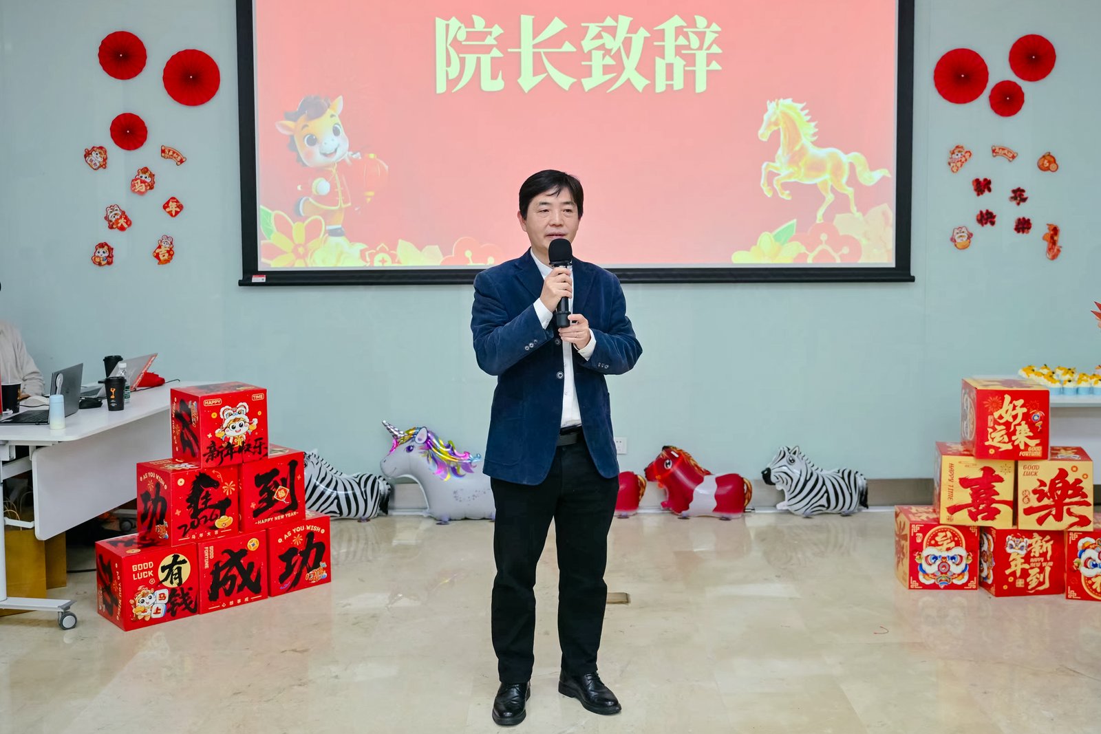 Dean Liao Hong'en of the School of Biomedical Engineering delivering a New Year speech